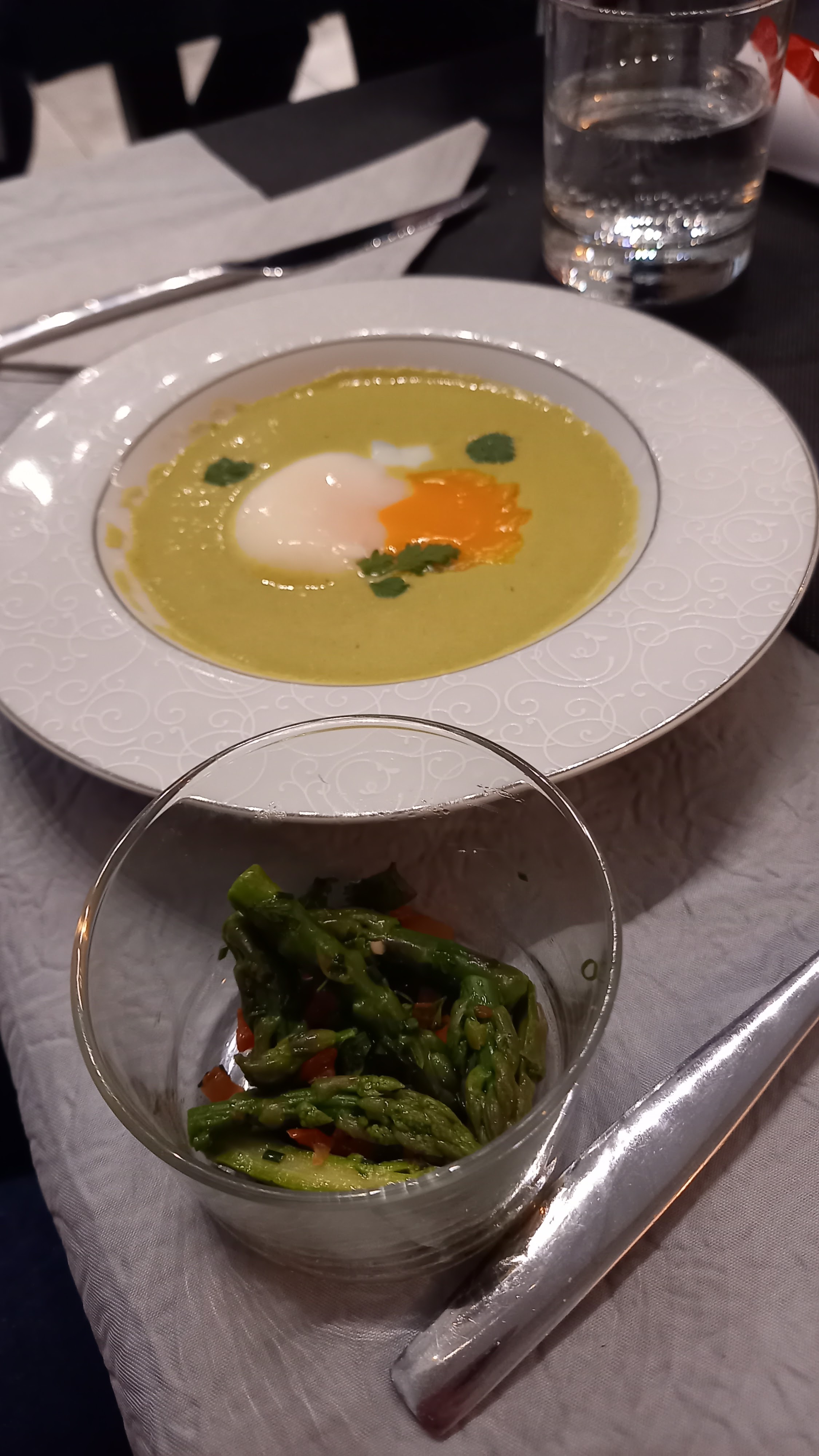 Repas stressant et bâclé ( du gavage, pas entendue par le serveur, des oublis dans les plats annoncés, une verrine degeulasse: j'ai eu du velouté plein les mains et on a même pas changé ma verrine que j'ai du nettoyer seule) Peut être ont t-ils expédiés les petites tables au profit des grandes à l'occasion de Noël ... A déconseiller si vous êtes deux...
