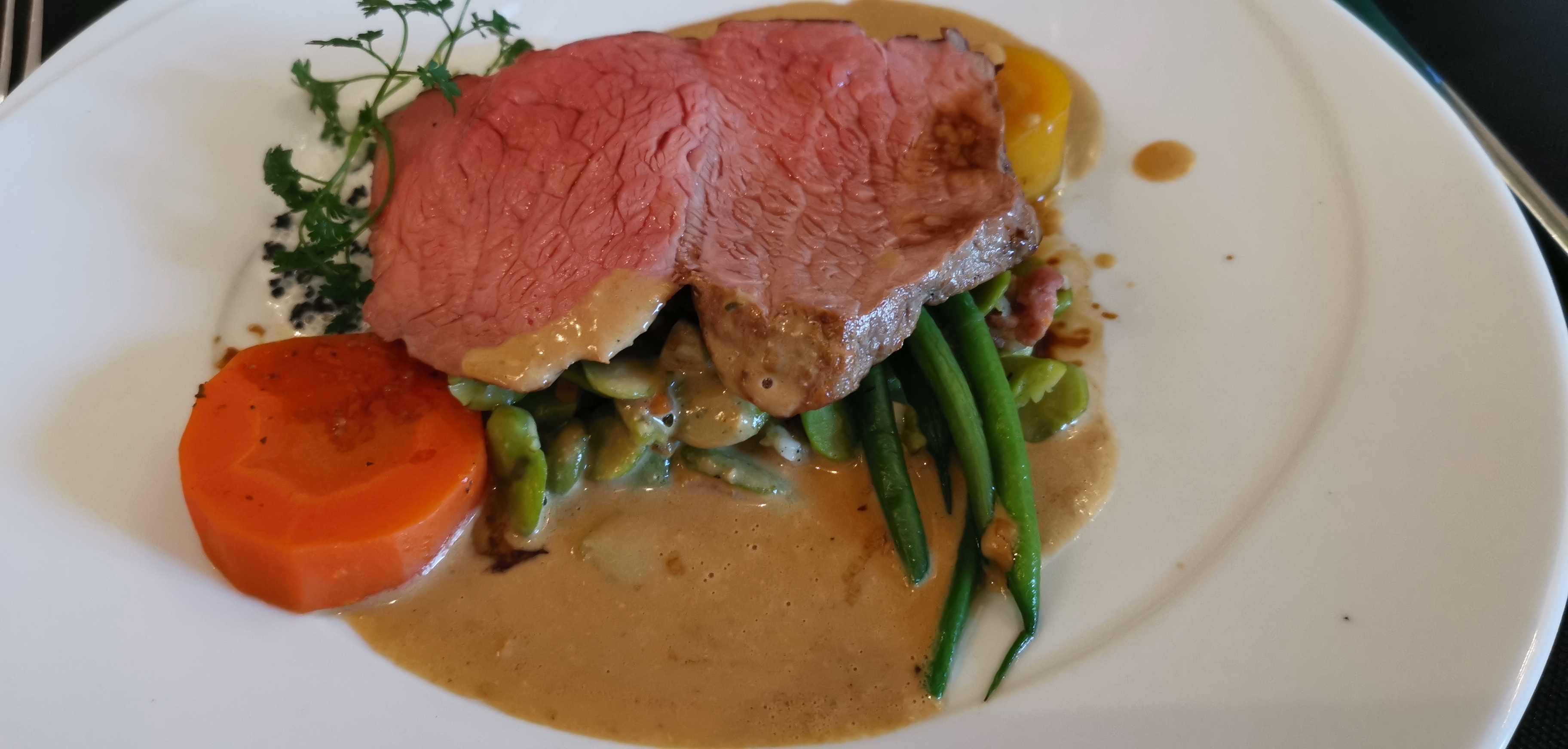 Vraiment très bon au niveau gustatif ! Le cochon infusé au foin avec son jus corsé était vraiment exceptionnel