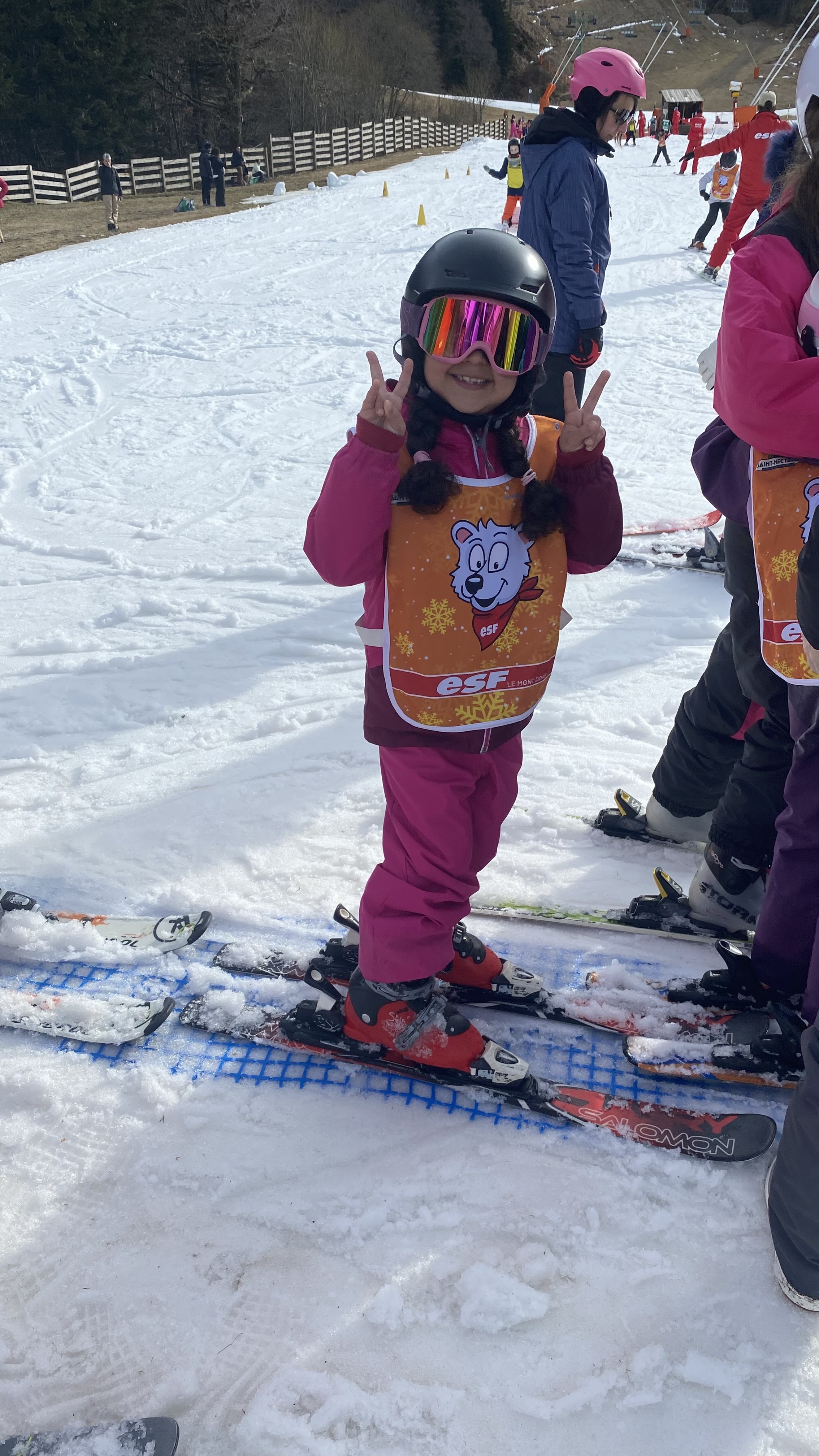 Premier cours de ski pour notre enfant de 3ans. Coraline les à très bien accompagnés, une bonne école !