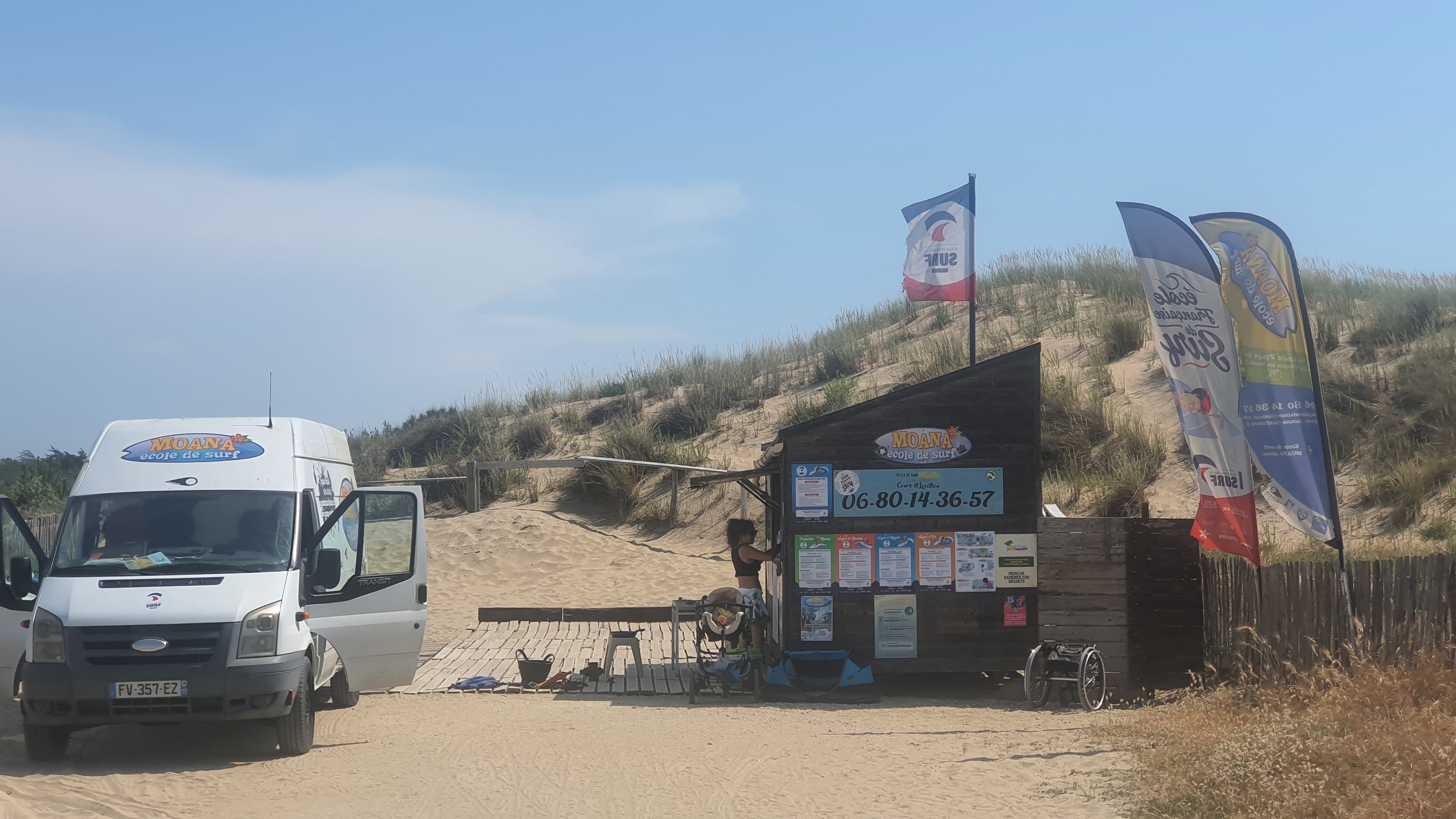 Petite école de surf avec un équipage très sympa. L'emplacement est idéal pour apprendre le surf et est magnifique aussi avec l'épave et la longue plage. Les enfants ont suivi un cours de 5 jours et ont vraiment eu « la fièvre ». Merci Baptiste²&équipage